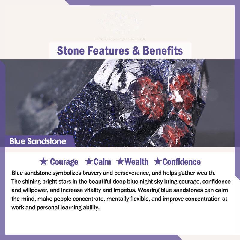 Blue sandstone symbolizes bravery and perseverance, and helps gather wealth. The shining bright stars in the beautiful deep blue night sky bring courage, confidence and willpower, and increase vitality and impetus. Wearing blue sandstones can calm the mind, make people concentrate, mentally flexible, and improve concentration at work and personal learning ability.