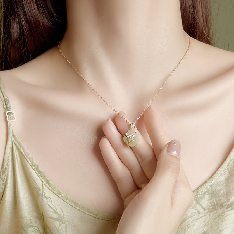 Buddhist Blessing 925 Sterling Silver Magnolia Butterfly Hetian Jade Four Leaf Clover Blessing Earrings Necklace Pendant