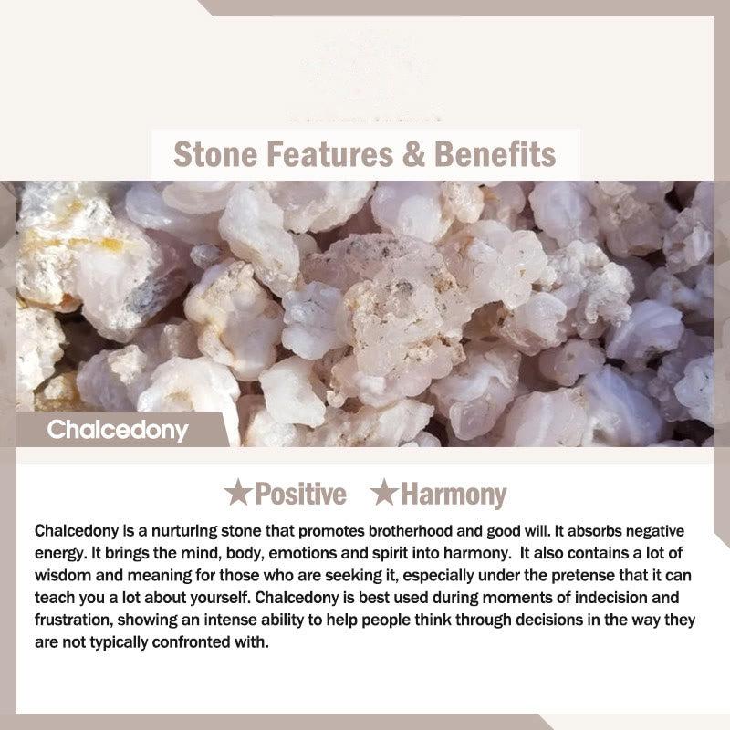 Chalcedony is a nurturing stone that promotes brotherhood and goodwill. it absorbs negative energy. lt brings the mind, body, emotions, and spirit into harmony. it also contains a lot of wisdom and meaning for those who are seeking it, especially under the pretense that it can teach you a lot about yourself, Chalcedony is best used during moments of indecision and frustration, showing an intense ability to help people think through decisions in the way they are not typically confronted with.