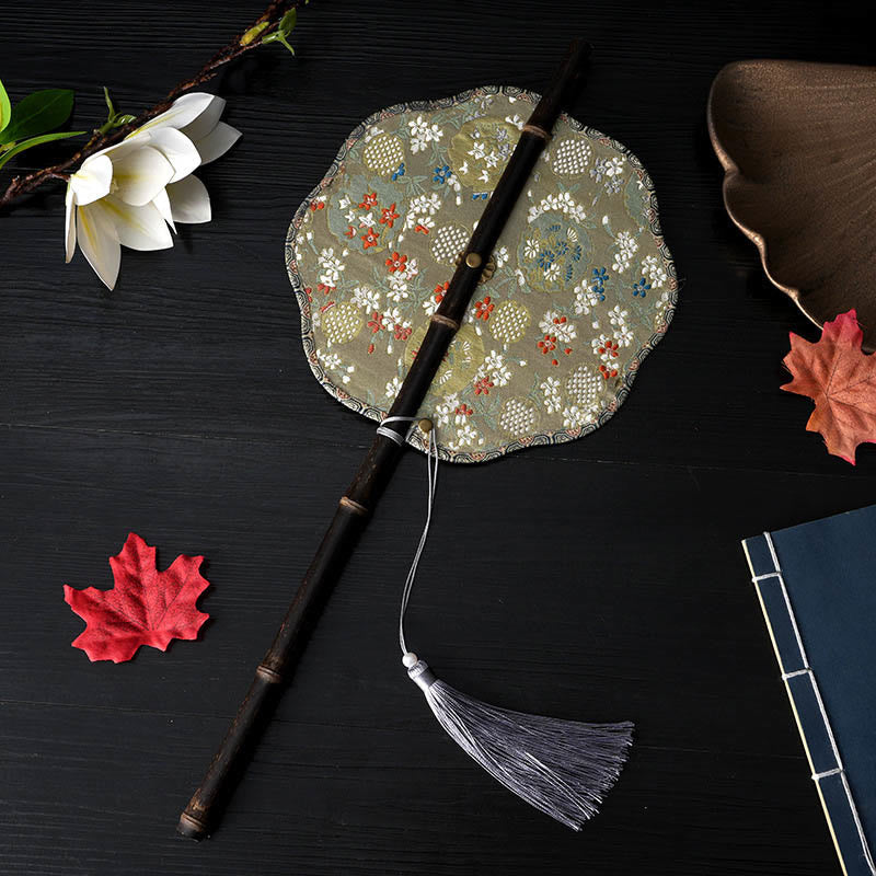 Purple Bamboo Handle fan features an intricate pattern of flowers, peach, loquat, birds, cranes, and butterflies. The fan is crafted with a long purple bamboo handle, offering a graceful blend of durability and elegance. Perfect for a touch of traditional charm, this portable, curlable fan not only provides a refreshing breeze but also adds a beautiful decorative element to any setting.💕