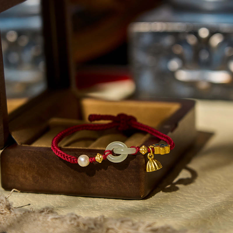 Buddhist Blessing Hetian Jade Lotus Peace Buckle Braided Rope Fortune Bracelet