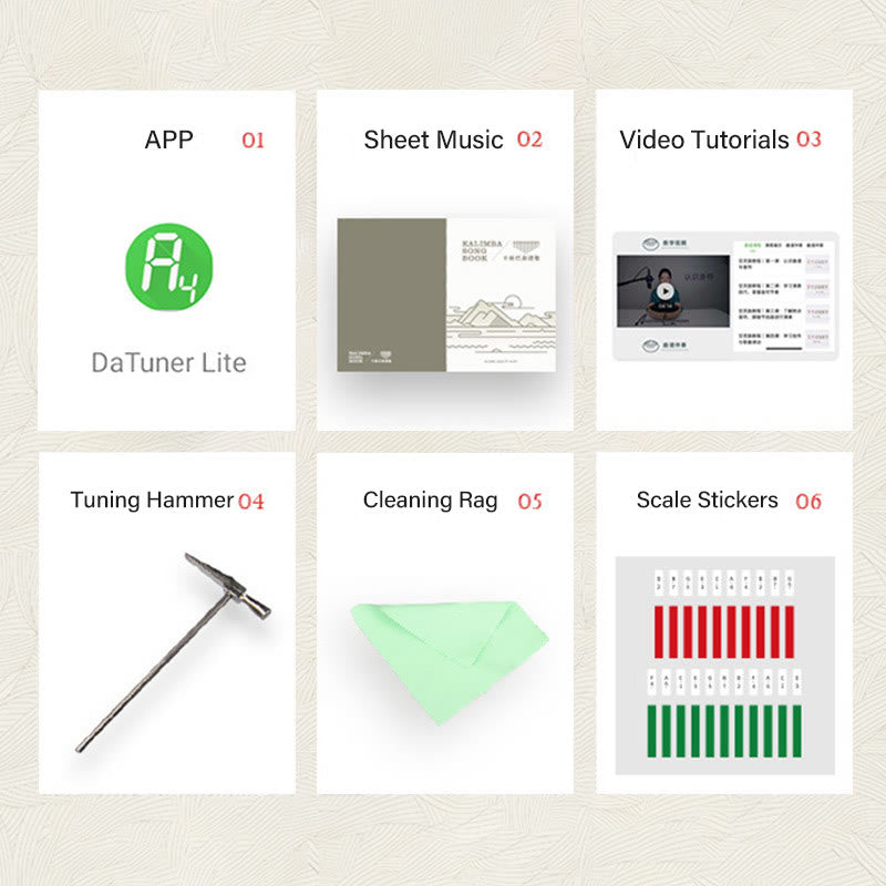 - Package Included: Kalimba*1, Kalimba Songbook*1, Tuning Hammer*1, Note Sticker*1, Cleaning Cloth*1