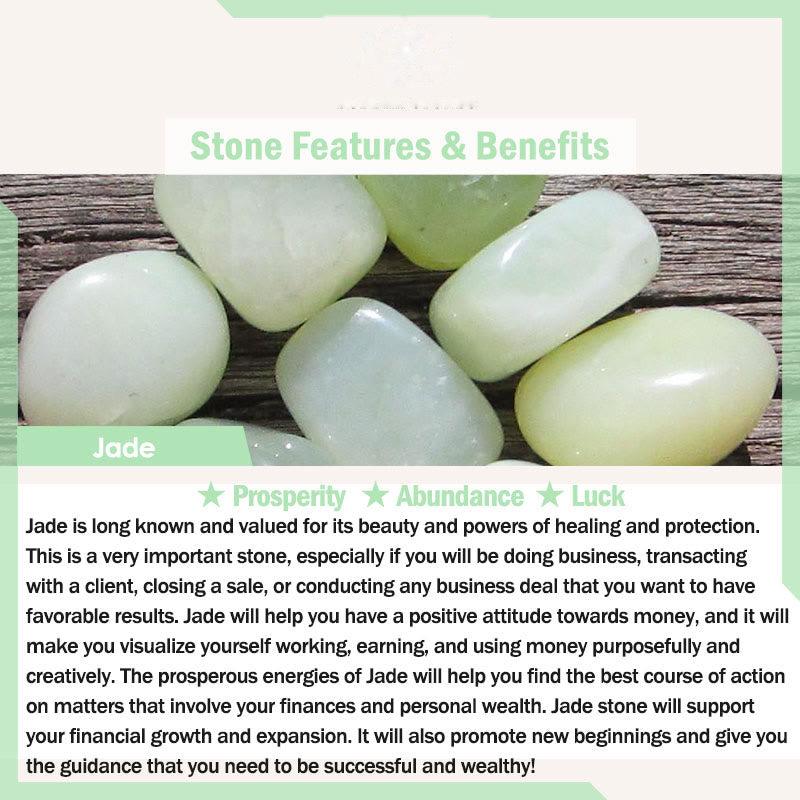 Jade is long known and valued for its beauty and powers of healing and protection. This is a very important stone, especially if you will be doing business, transacting with a client, closing a sale, or conducting any business deal that you want to have favorable results. Jade will help you have a positive attitude towards money, and it will make you visualize yourself working, earning, and using money purposefully and creatively. The prosperous energies of Jade will help you find the best course of action on matters that involve your finances and personal wealth. Jade stone will support your financial growth and expansion. It will also promote new beginnings and give you the guidance that you need to be successful and wealthy!