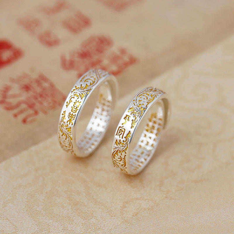Buddhist Blessing Peace and Joy Tang Dynasty Flower Design Lotus Heart Sutra Carved Copper Luck Adjustable Ring