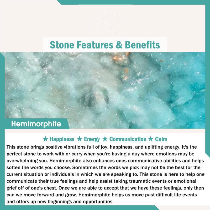 This stone brings positive vibrations full of joy, happiness, and uplifting energy. It's the perfect stone to work with or carry when you're having a day where emotions may be overwhelming you. Hemimorphite also enhances ones communicative abilities and helps soften the words you choose. Sometimes the words we pick may not be the best for the current situation or individuals in which we are speaking to. This stone is here to help one communicate their true feelings and help assist taking traumatic events or emotional grief off of one's chest. Once we are able to accept that we have these feelings, only then can we move forward and grow. Hemimorphite helps us move past difficult life events and offers up new beginnings and opportunities.